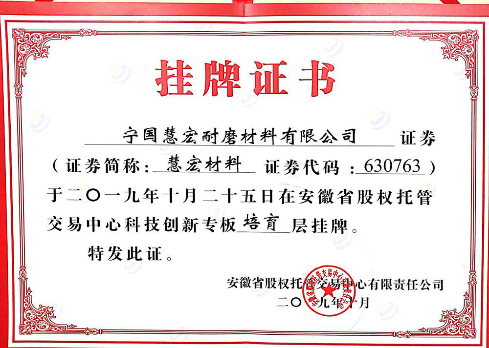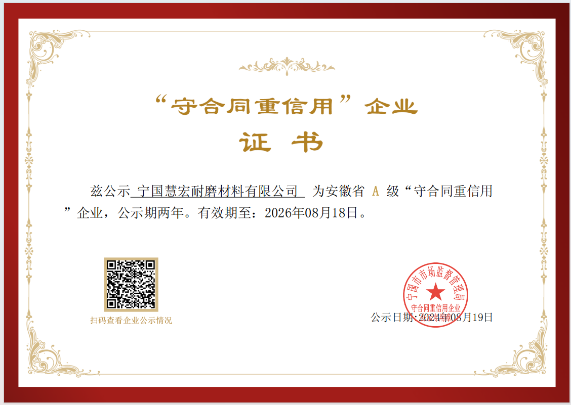 可靠的設(shè)備,才能長(zhǎng)久穩(wěn)定運(yùn)行全面推行ISO9001;2000版質(zhì)量管理體系標(biāo)準(zhǔn),秉承“科學(xué)管理、精心制造、優(yōu)質(zhì)服務(wù)、追求卓越”的質(zhì)量方針,不斷打造高端耐磨材料產(chǎn)品。
